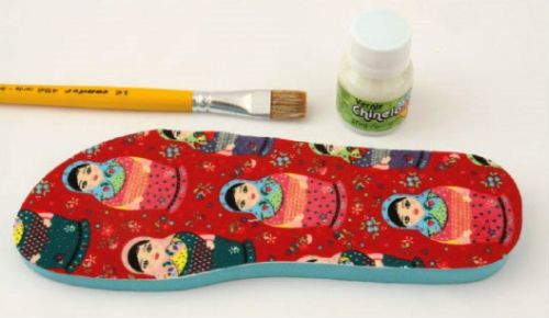 Comece retirando as tiras do chinelo. E com o auxílio da caneta, risque o tecido conforme o molde do chinelo.